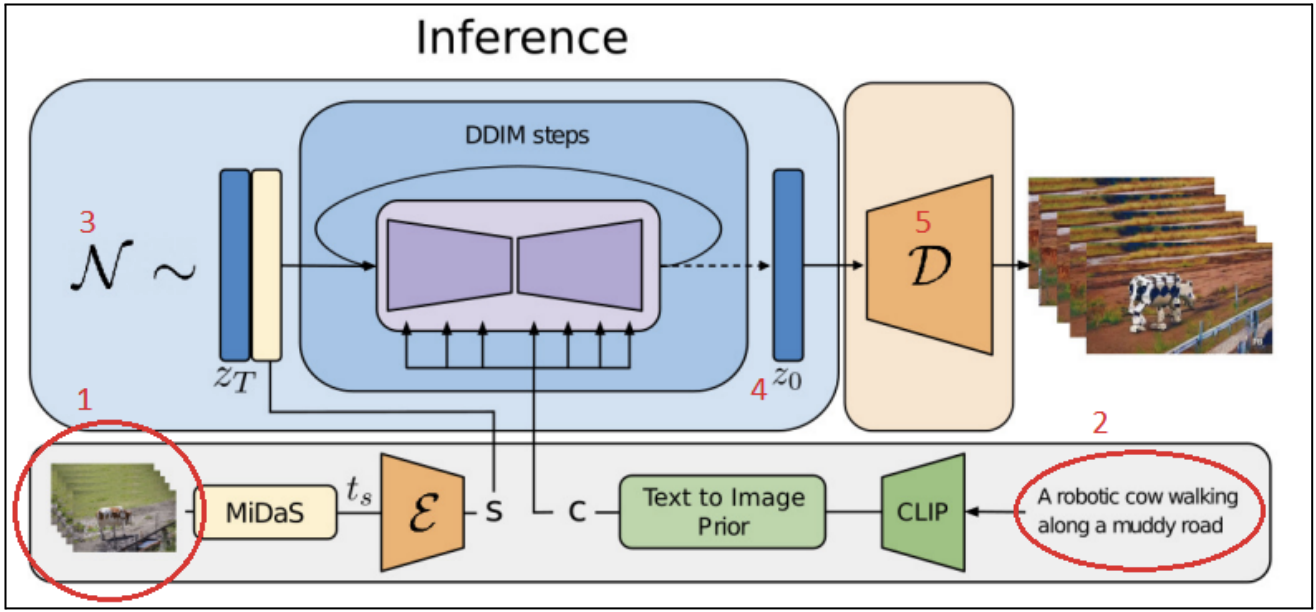 Ce processus est en 5 étapes, les 1 et 2 sont dans le bas de l’image, les 3,4, et 5 dans le haut de l’image. Lorsque l’on fournit à l’IA une vidéo donnée (entouré à gauche, vidéo d’une vache dans un enclos) et un prompt pour la customiser (entouré à droite le texte demandant une vache robot), voici comment le système fonctionne :