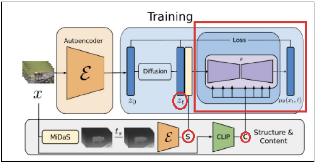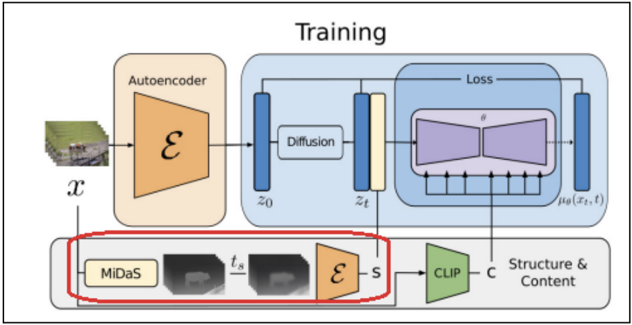 A partir de x, on applique un MiDaS, puis on réalise une diffusion pour obtenir le jeu de données ts, puis un encodage permet d’obtenir le jeu de données s.